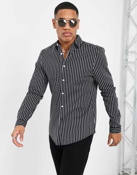 Black Printed Stripes Shirt Collar Casual Shirts Tops Salolist Com Casual Striped Shirt Mens Slim Shirt Striped Long Sleeve Shirt